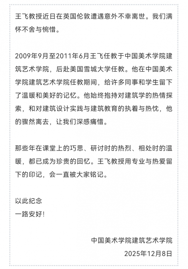 值得关注的是,王飞在国内也有很多的教学和项目,他曾经在中国美术学院建筑艺术学院任教,王飞去世后,该学院也在第一时间发布了讣告,以悼念这位故人,感谢王飞教授为学院作出的贡献,一切都将成为珍贵的回忆。
