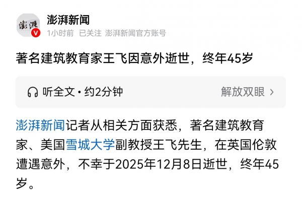 12月9日,网络上传出一则突发消息,称同济大学校友、著名的建筑教育家王飞教授去世了,年仅45岁,要知道这个年龄的大学教授,正是人生和事业最辉煌的时候,为何会出现这样的悲剧呢?