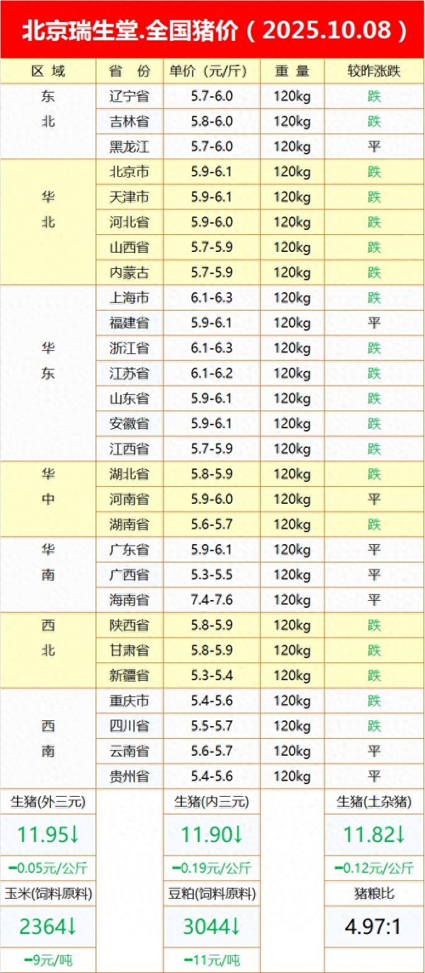 全国猪价数据,再次给养殖户们泼了一盆冷水。全国大部分地区猪价延续跌势,仅少数省份持平,无一上涨。外三元生猪价格跌至11.95元/公斤,内三元和土杂猪价格也分别在11.90元/公斤和11.82元/公斤徘徊,猪粮比更是跌至4.97:1,远低于盈亏平衡点。这意味着,每出栏一头猪,养殖户可能就要亏损数百元。