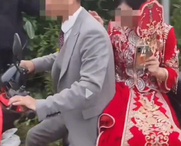 新郎没吵没闹,没叫拖车,没喊保安,就推了辆电动车出来,顺手帮新娘戴上头纱,说走就走。