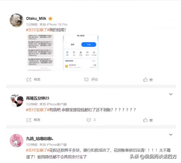11月11日上午,"支付宝崩了"的话题登上了微博热搜。多名用户反映支付宝App出现了异常状况,包括同一笔订单被重复扣款、余额宝转账至余额后余额显示为0、线下支付后商家未收到款项但银行卡已被扣款等问题。其中,一位用户表示,自己的同一笔订单被扣款了三次,共计七百多元。另一位用户发现,自己的余额宝提现一直处于等待处理中,无法到账。更有甚者,有网友在评论区表示,扣款22次,又全部还回来,早上一共44笔消费订单。