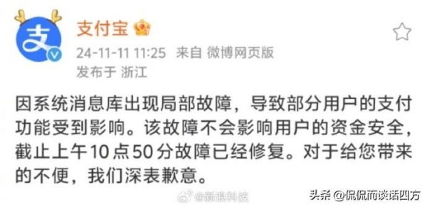 面对用户的质疑和担忧,支付宝官方微博对此作出回应:因系统消息库出现局部故障,导致部分用户的支付功能受到影响。该故障不会影响用户的资金安全,截止上午10点50分故障已经修复。对于给您带来的不便,我们深表歉意。