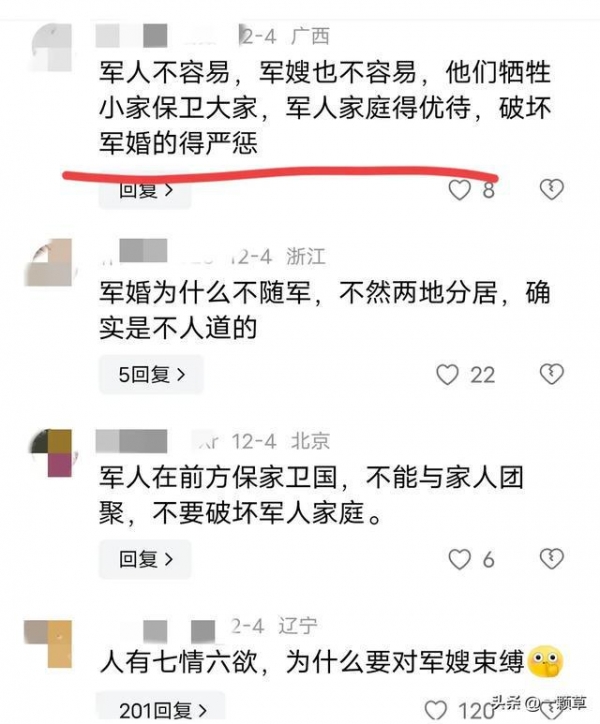 女子也真是的,当初结婚的时候就应该想好,如果耐不住以后的寂寞,尽量不找军人结婚,但既然结婚了,就要对此负责到底,出轨是万万不能的。