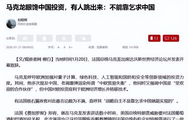 2026年1月,达沃斯论坛又热闹起来了。法国总统马克龙开口,就直奔中国投资和技术转移的话题而去,让人不由得想起普京几年前那句点睛之言:欧洲安全得靠美国,经济却离不开中国。