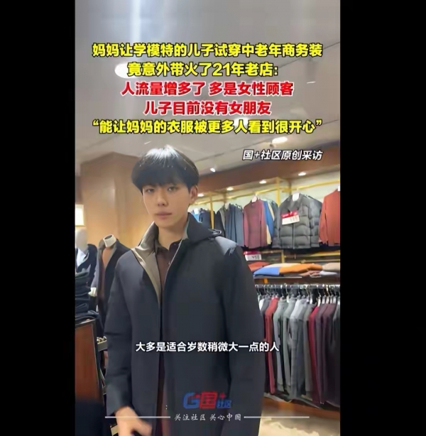 1米86服表小伙替妈试穿中老年装意外爆红,21年男装老店迎十倍客流,却陷流量客群与消费客群错位的现实难题。