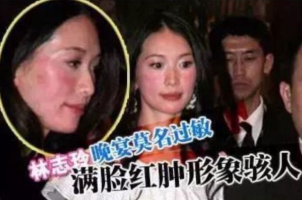 林志玲因为空腹喝酒导致过敏,脸部红肿一片,差点毁容。