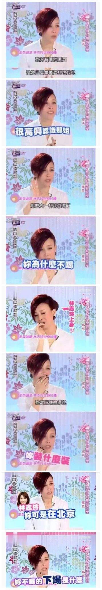 有一次那英让林志玲喝酒,她说喝酒过敏,那英很不高兴,你举杯敬别人,到我这不喝了?
