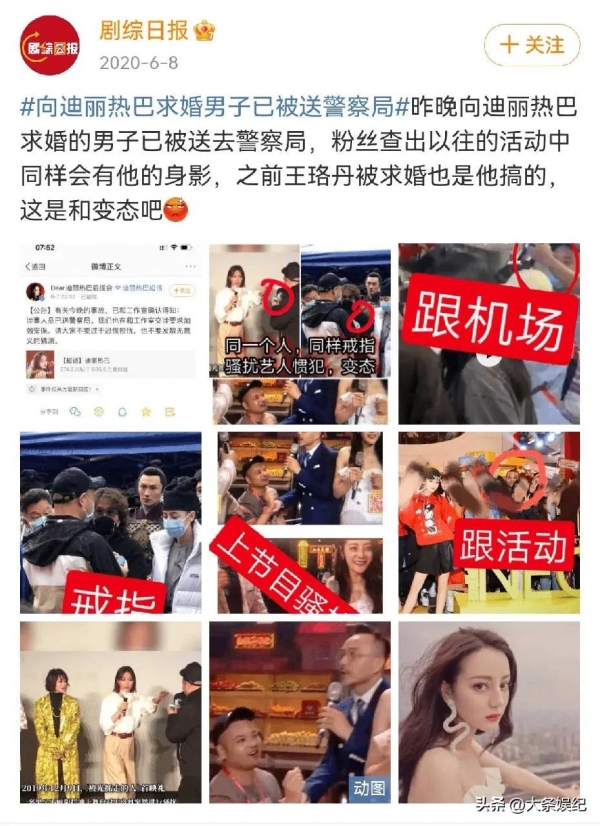 同样是这个男的,在芒果助农活动的直播现场突然向迪丽热巴求婚,他的骚扰行为还包括跟迪丽热巴的机场和活动。这个人就是惯犯,货真价实的变态男。