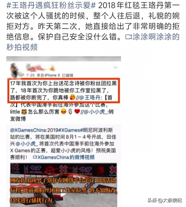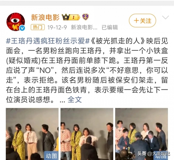 这个男的已经连续三次这样骚扰王珞丹,2017年念诗,2018在电影活动的红毯跪地求婚,王珞丹当场表明拒绝的态度。工作室和粉丝团把他账号拉黑后还发动态反过来指责王珞丹。
