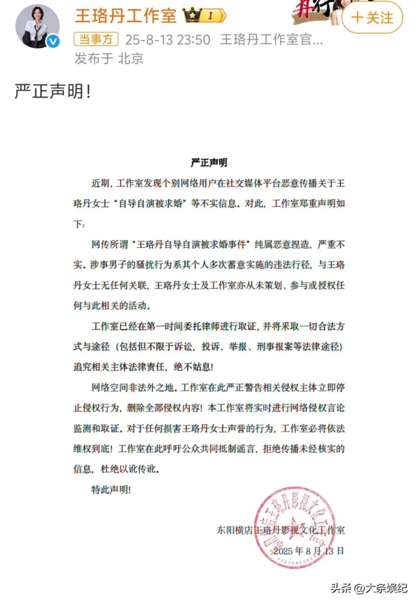 最近网上突然出现这件事情是她自导自演的流言,王珞丹工作室发声明否认,称这个男的举动属于骚扰行为,跟她以及她的团队无关。