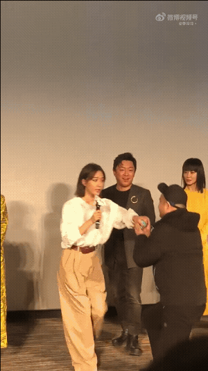 王珞丹在《被光抓走的人》路演现场遇到突发状况,某男子突然冲上台向她,她表情惊恐,立马上前按下打开戒指盒子的动作,被吓到后面直接翻白眼了。