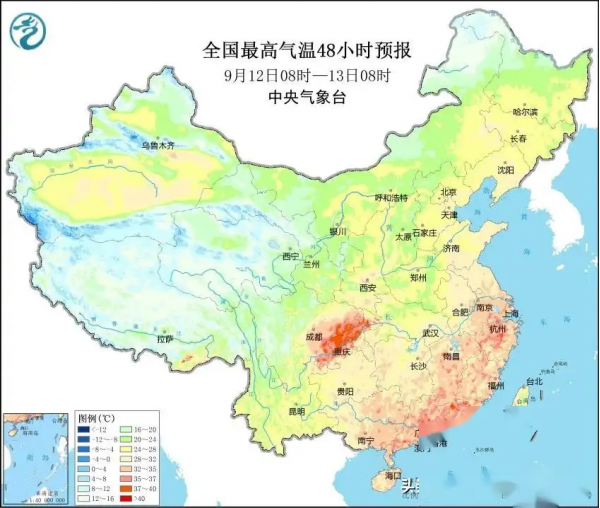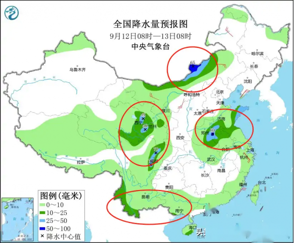 9月12日,北方内蒙古中西部、青海东部等地有中到大雨,南方安徽北部、江苏北部等地也有降雨。