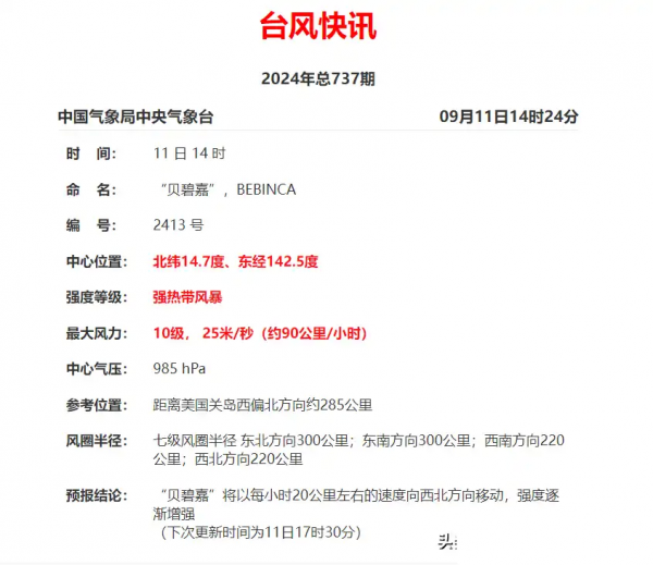 预计在9月15日前后,"贝碧嘉"将穿过琉球群岛进入邻近海域,并且随着中秋节假期即将到来,"贝碧嘉"可能会在东方大国沿海地区登陆,请各位朋友密切关注最新天气动态。