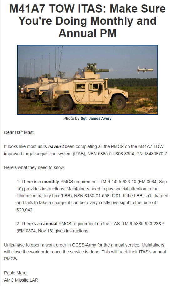 (美军内部发送的对M41A7"改进型目标捕获系统"每月保养的提示信息)