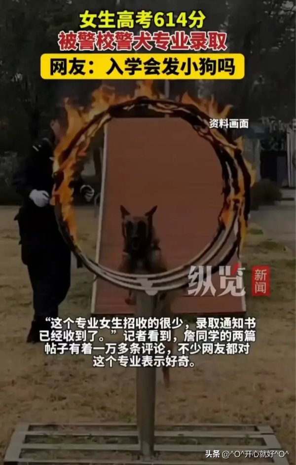 最近,江苏南京一位女生。今年高考分数614分,在全省排名1907名,这样的成绩在本省也是很好的了,这位女生说,她平时喜欢小狗,家中养了一条小狗,填报志愿的时候,她发现有警犬这个专业,想到学习时能够和狗狗一起玩,她非常高兴,一下子就爱上了这个专业,于是她毫不犹豫地报了这个专业。最后,她被南京警察学院警犬技术专业录取了。