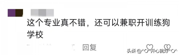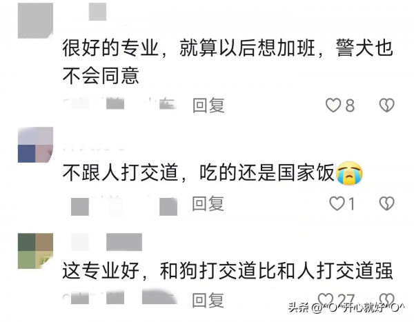 网友认为,警犬技术专业,是一个非常好的专业。一上学就发小狗,在上学期间一边学习一边和小狗玩儿。上大学能够摸着小狗,想起来是一件挺开心的事。而且这个专业一毕业就当警察,有编制。上班也离不开狗狗,真的不错。
