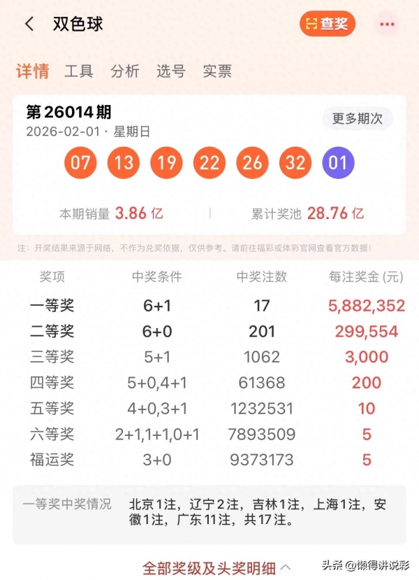 2月1日晚开奖的双色球第2026014期,全国共中出一等奖17注,单注奖金588万余元。其中广东一省独揽11注,成为本期开奖的最大亮点。