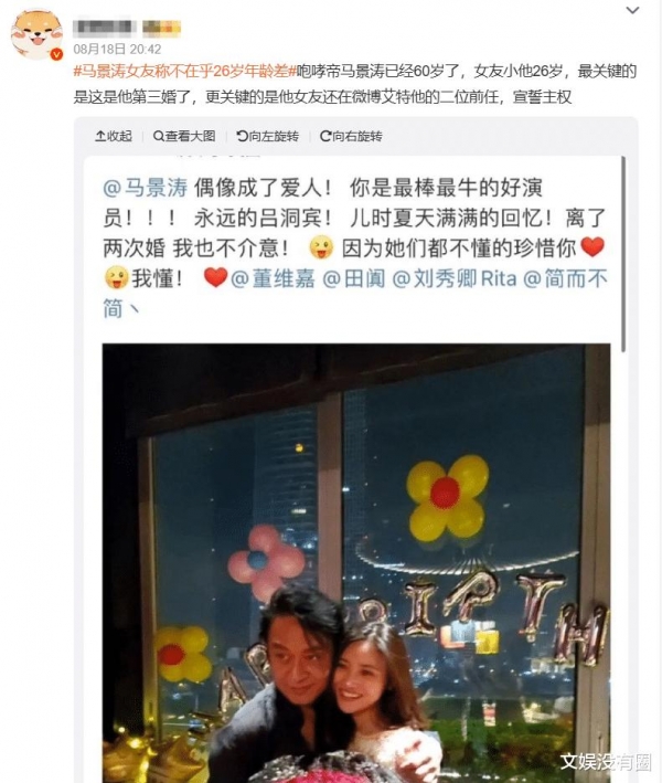 不过,真正让网友表示"没眼看"的,是她此前在微博的帖文:"偶像成了爱人,你是最牛的好演员……离了两次婚我也不介意,因为她们都不懂得珍惜你,我懂。"更绝的是,她还特意@了马景涛的前任们,疑似隔空喊话。这番操作立刻引发热议,有人吐槽:"恋爱就恋爱,拉踩前任是几个意思?"也有人调侃:"这台词怎么莫名像《三十而已》里林有有的风格?"