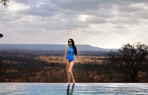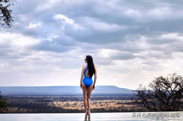 照片中的她,身穿克莱因蓝连体泳衣,胸前挖空设计大方秀事业线。