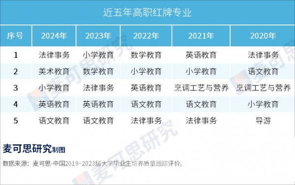 另外尤为值得关注的是,《2024年中国高职生就业报告》数据显示,近五年的高职红牌专业(指就业落实率、薪资和就业满意度综合较低,且市场需求减少或增长缓慢的专业),教育类专业占比较高。其中,小学教育、语文教育连续5次被预警,英语教育4次被预警。