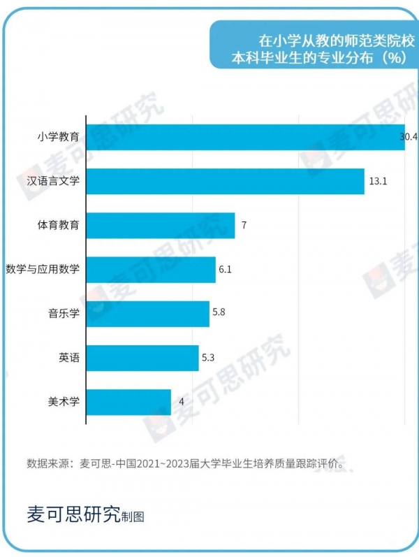 主要从在小学从教的师范类院校本科毕业生的专业构成来看,小学教育专业占三成以上(30.4%),是服务小学教育领域的主体;其后依次是汉语言文学(13.1%)、体育教育(7.0%)、数学与应用数学(6.1%)等,这些专业基本涵盖了小学教育的主要学科方向。