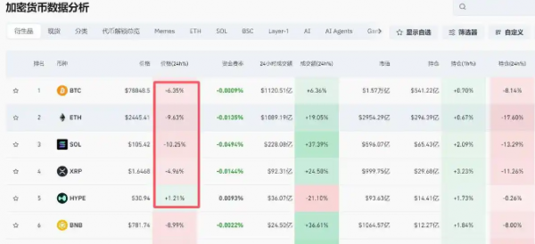 1月31日晚上以来,整体加密货币市场再度大跌。OKX数据显示,比特币(BTC)价格一度下探至7.56万美元附近,目前报7.83万美元左右,创下近2025年4月以来的新低;以太坊(ETH)报2443美元左右,也曾一度跌至2240美元;SOL则一度跌破100美元,目前回升至104美元左右;狗狗币(DOGE)报0.104美元左右。