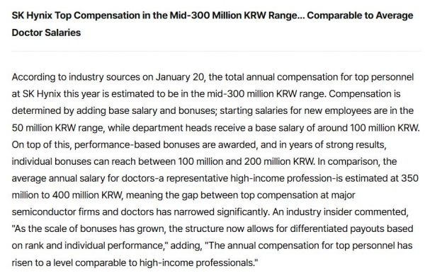 SK海力士的员工有多爽?据报道,这家公司直接取消了奖金上限,给员工发放的绩效奖金高达基本工资的1500%--相当于一次性就拿到手全年收入四分之三的额外奖金。顶尖员工的年薪能达到3.5亿韩元(约合人民币175万元),直接逼近韩国医生的平均收入水平(3.5-4亿韩元)。