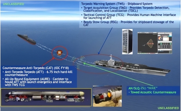 而在具体的作战流程上,这套硬杀伤反鱼雷系统的作战流程是这样的:首先由航母自己的拖曳式声呐或者舰壳声呐探测守听,由于鱼雷来袭的时候水声噪音比较大,可以据此明确来袭鱼雷的航位和深度等。确定射击诸元后,由反鱼雷系统发射装置发射反鱼雷鱼雷。