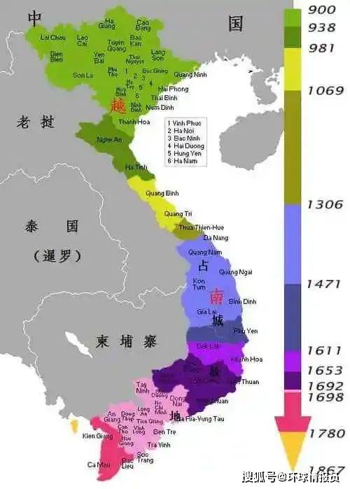 越南北方是强大的中国,向东是广阔的南海,西部是高耸的长山山脉,南进成为唯一的扩张选择。据《大越史记全书》记载,1009至1400年,越南发动大规模对外征伐40次,多数是向南扩张。