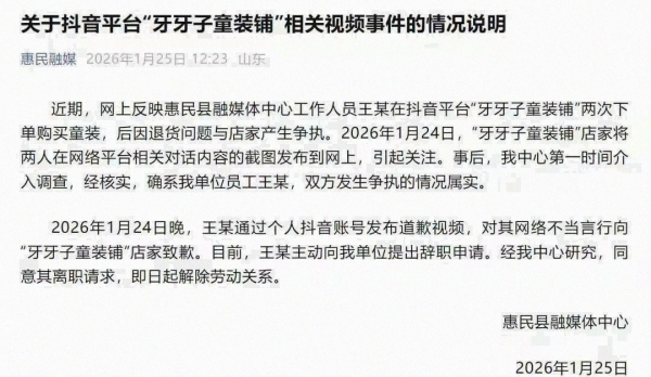 1月25日,惠民县融媒体中心发布情况说明,确认其为本单位员工,王某主动提出辞职,单位同意,立即解除劳动关系
