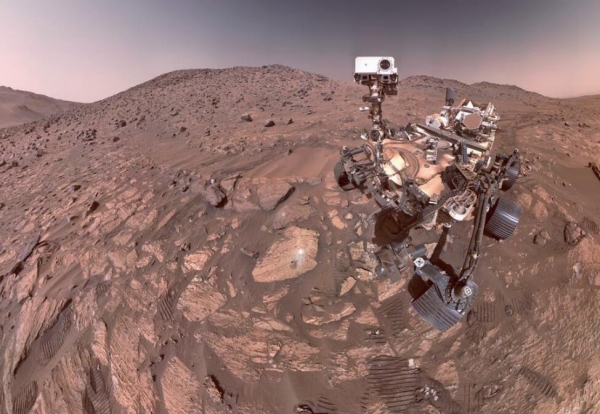 (↑"毅力号"于2024年7月23日拍摄了这张由62张独立图像组成的自拍照,"豹纹"岩石位于其左侧靠近中心的位置)