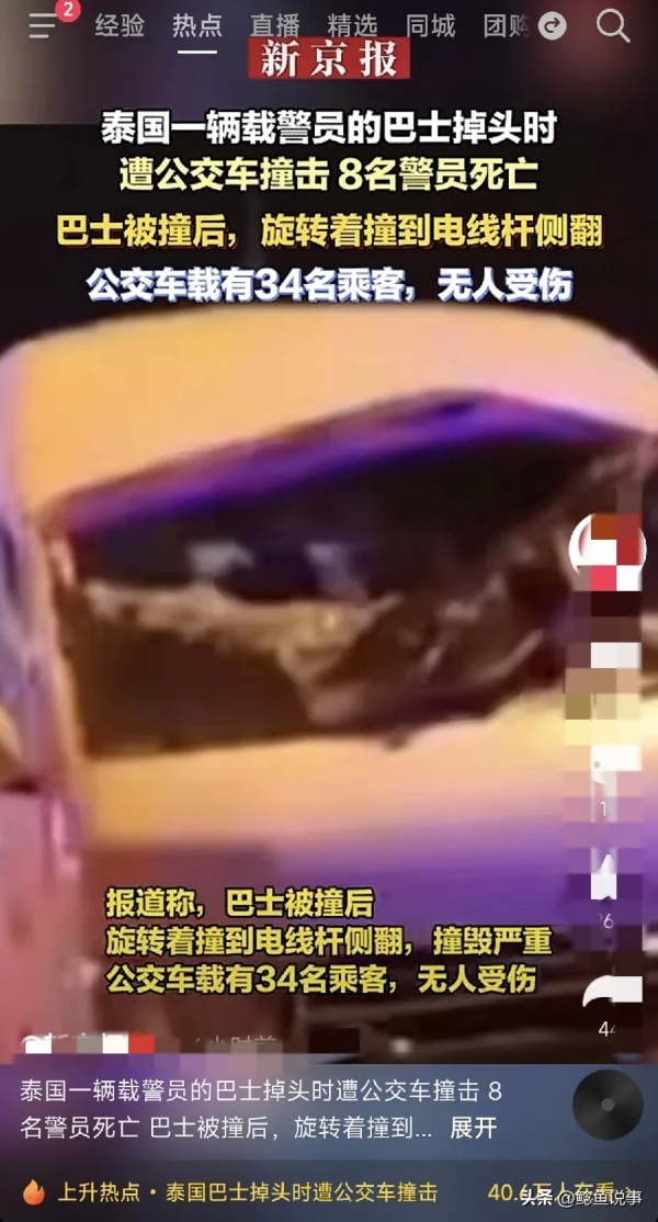 2月14号,泰国曼谷发生了一起特别严重的交通事故。一辆载着警员的巴士,在路中间掉头的时候,突然被一辆公交车狠狠地撞了上去。这一撞,巴士直接失控,旋转着就撞上了电线杆,然后侧翻在一旁,整个车身损毁得那叫一个严重。