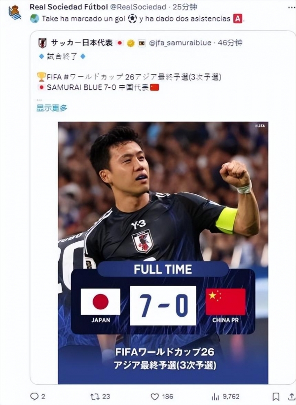 由于日本队有20个来自欧洲联赛的球员,而在日本队踢球大胜之后,日本队员所在俱乐部都发布了日本队7:0狂胜中国队的消息,向日本队球员发出祝贺: