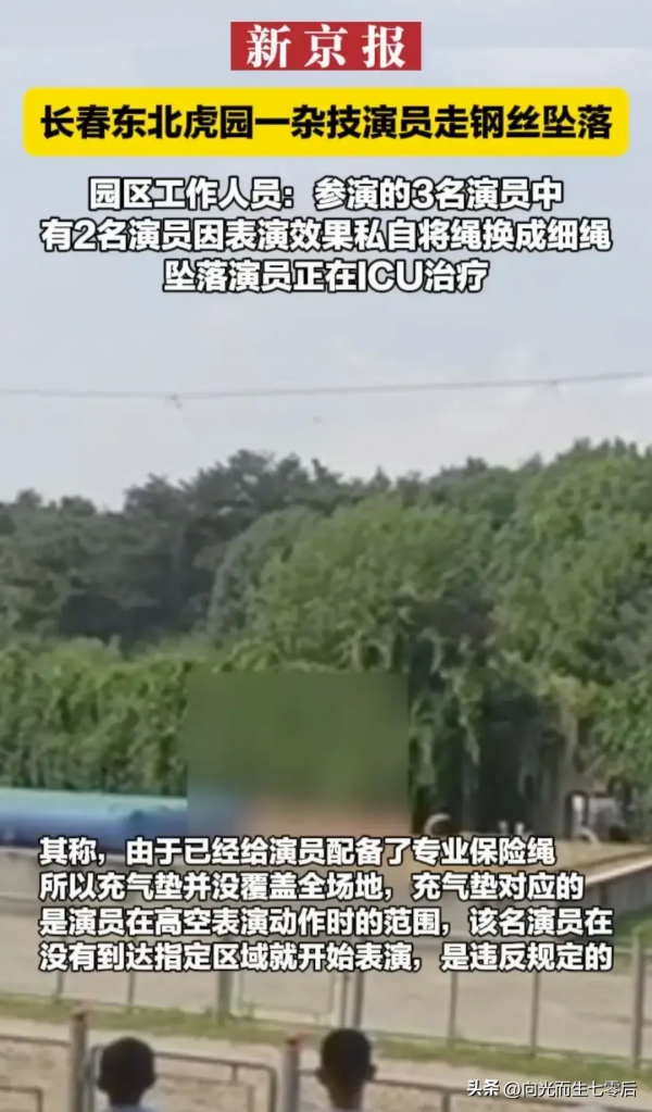 8月19日,吉林东北虎园发生一件"意外"事故--进行高空走钢丝的演员,竟然为了表演效果私自把保险绳换成了细绳。而最关键的是--