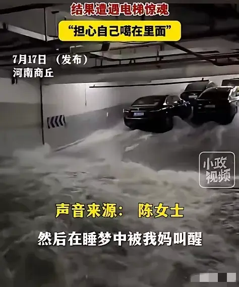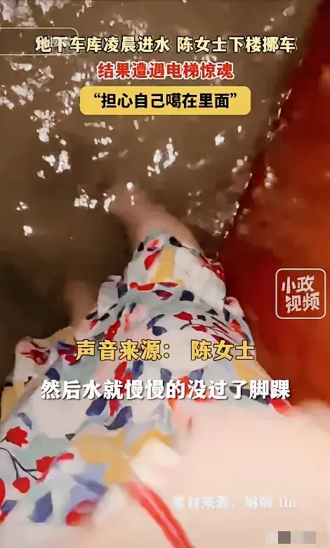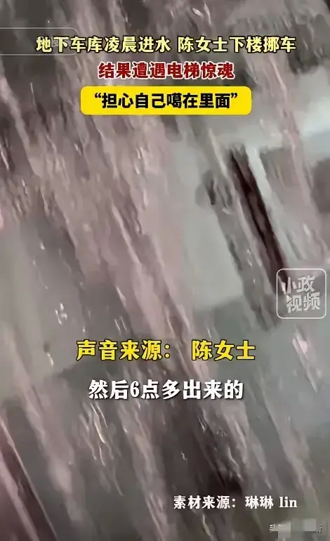 电梯到负一层,陈女士听到外面有水声,心里"咯噔"一下。到负二层,水"哗啦"一下就从电梯缝涌进来,一下就没过了脚踝。