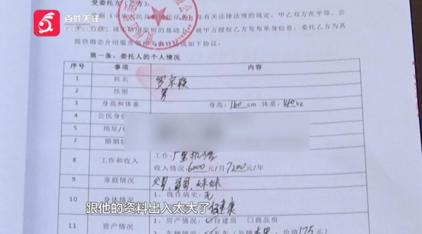 红线连婚恋公司负责人:他资料上写的是年收入8万,但把他的工资调出来,最多的三千多,一般两千多,跟他的资料出入太大了。确实审核有限,我们能审核的是什么?做婚检、查征信、查大数据。那至于其他的,比如说女方的一些民间借贷,那我查不到。