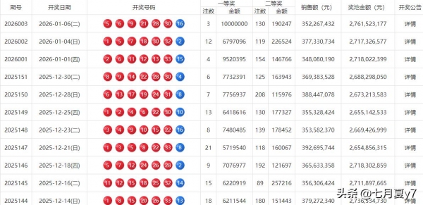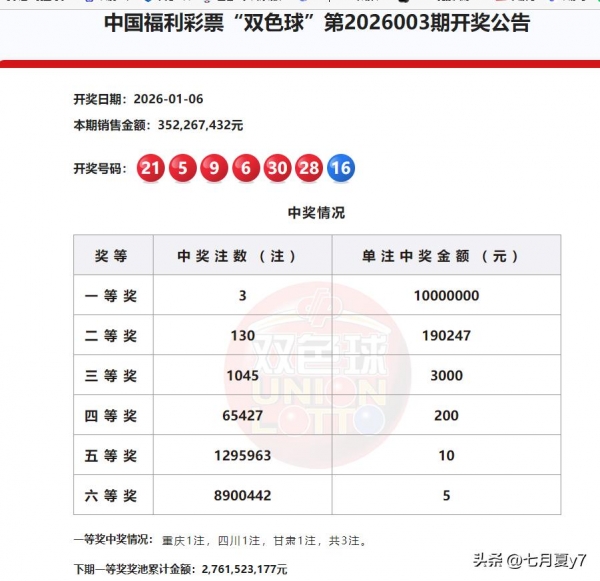 2026年1月6日,中国福利彩票双色球游戏第2026003期开奖。本期全国销量为3.52亿元,开奖后奖池资金累积至27.61亿元,持续高位运行。