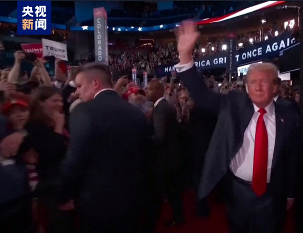 这是特朗普在13日经历竞选集会枪击事件之后,首次出现在大型集会活动现场。