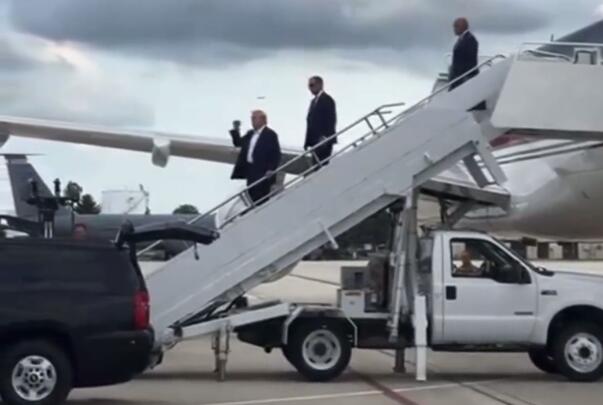 遭遇枪击后,特朗普抵达密尔沃基准备出席共和党大会,下飞机时挥舞拳头。