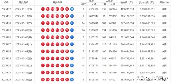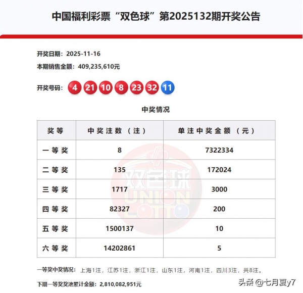 2025年11月16日,中国福利彩票双色球第2025132期开奖结果揭晓。本期销售总额409,235,610元,开奖号码为红球04、10、08、21、23、32,蓝球11。