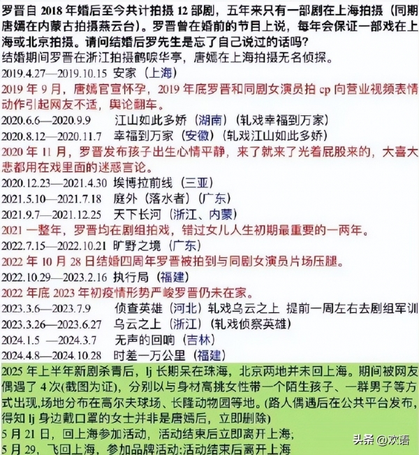 根据唐嫣粉丝提供的罗晋行程来看,罗晋从结婚至今,几乎全年无休,回家的时间屈指可数。
