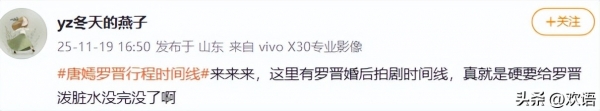 随着事情的发酵,唐嫣粉丝纷纷加入"离婚战场",罗列出罗晋的工作时间表,似乎把过错的一方归结到罗晋身上。