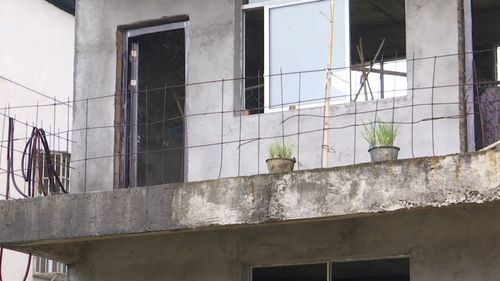 贴好瓷砖的教学楼里长出了比碗口还粗的树,墙面上还挂着"施工重地,闲人免进"警示牌。