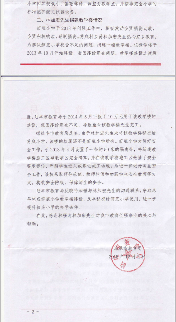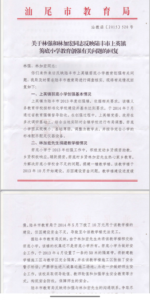 2015年12月,汕尾市教育局在一份回复中称,上述教学楼因建设资金问题,进度缓慢,陆丰市教育局于2014年5月下拨10万元用于该教学楼的建设,但因建设资金不足,导致该教学楼无法完工。据陆丰市教育局反映,由于林加宏未将该教学楼移交给笏底小学,该楼的权属还不是笏底小学所有。笏底小学为了做好安全工作,于2013年4月设置了一条约50米的隔离带,将新建教学楼施工区与教学区完全隔离,并在该教学楼施工区挂了安全警示标语,严禁学生进入或靠近施工场地。