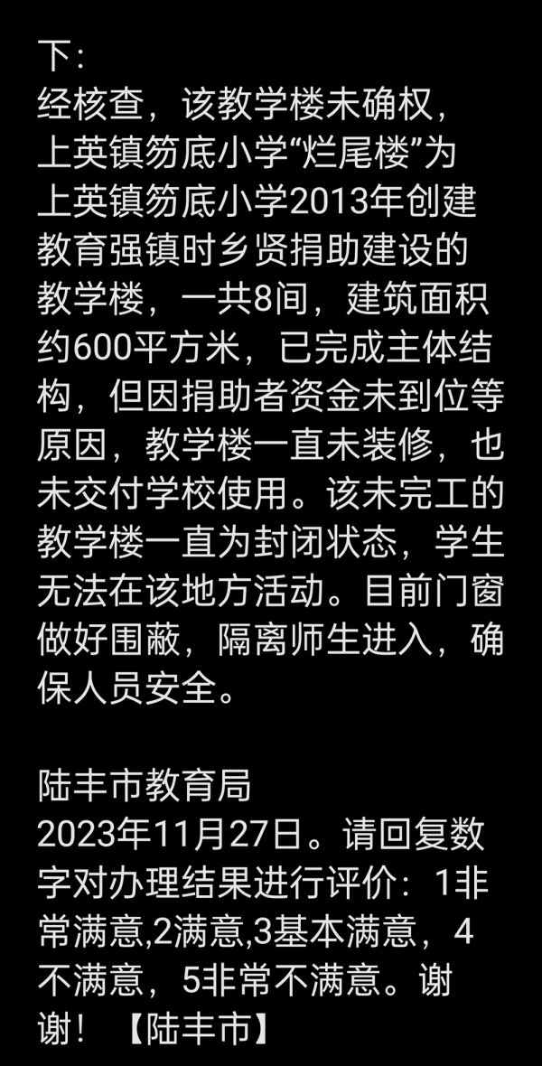 2023年11月,陆丰市教育局回复林加宏在12345的投诉时称,经核查,该教学楼未确权,是2013年创建教育强镇时乡贤捐助建设,一共8间,建筑面积约600平方米,已完成主体结构,但因捐助者资金未到位等原因,教学楼一直未装修,也未交付学校使用。该未完工的教学楼一直为封闭状态,学生无法在该地方活动。目前,门窗已做好围蔽,隔离师生进入,确保人员安全。