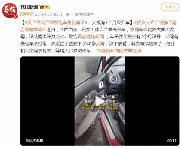 近日,陕西西安,石女士休完产假去开车,发现车内竟然大面积发霉,没法闻也没办法坐。她告诉@荔枝新闻 ,车子停在室外有7个月没开,期间有去给车子打电,最近由于西安下了40多天雨,没下去看,就发霉成这样了,估计和天窗漏水有关,等晴天打算晒晒车。