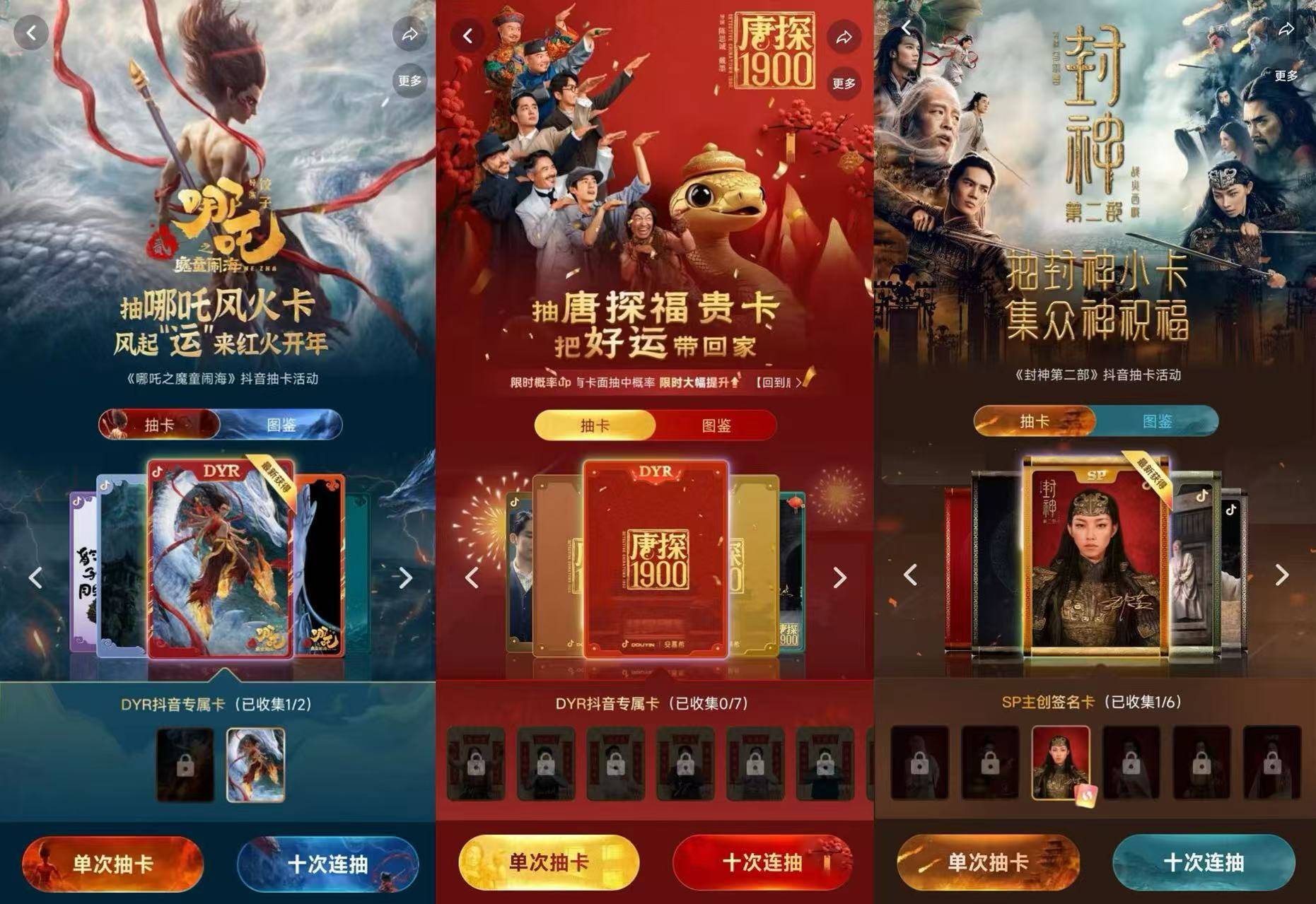 活动期间,抖音联合《哪吒之魔童闹海》《唐探1900》《封神第二部:战火西岐》三部电影推出抽卡活动,精美的卡面吸引了大量用户的参与。其中,超240万人参与到《哪吒之魔童闹海》的抽卡活动中,带动官号涨粉166万+,形成观影后的二次传播热潮。