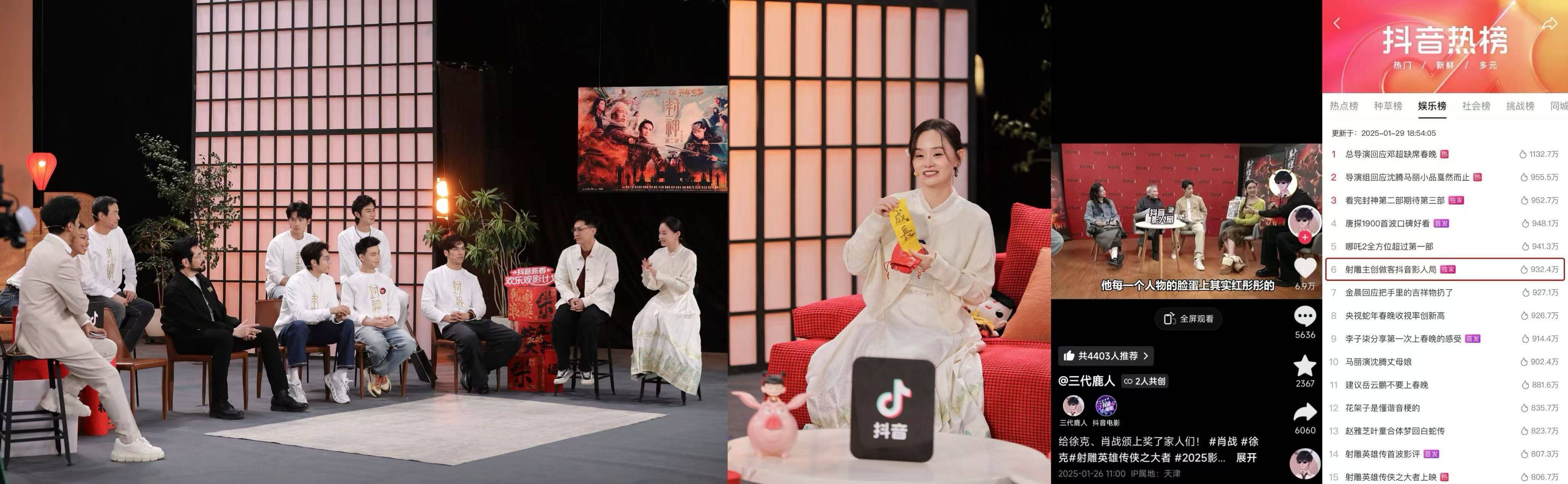 除此之外,抖音电影百评团成员更作为大家的"嘴替",对电影主创进行了专访。@婧公子 、@硬核卡子 与《哪吒之魔童闹海》、《封神第二部:战火西岐》主创在直播中展开深度互动,探究电影背后的创作故事;@三代鹿人 在与《射雕英雄传:侠之大者》的主创对谈中,向主演展示了抖音网友创作的海报,让影迷们的心意得以传达,而#射雕主创做客抖音影人局 也登上了抖音娱乐榜TOP6,进一步推动电影热度的增长。
