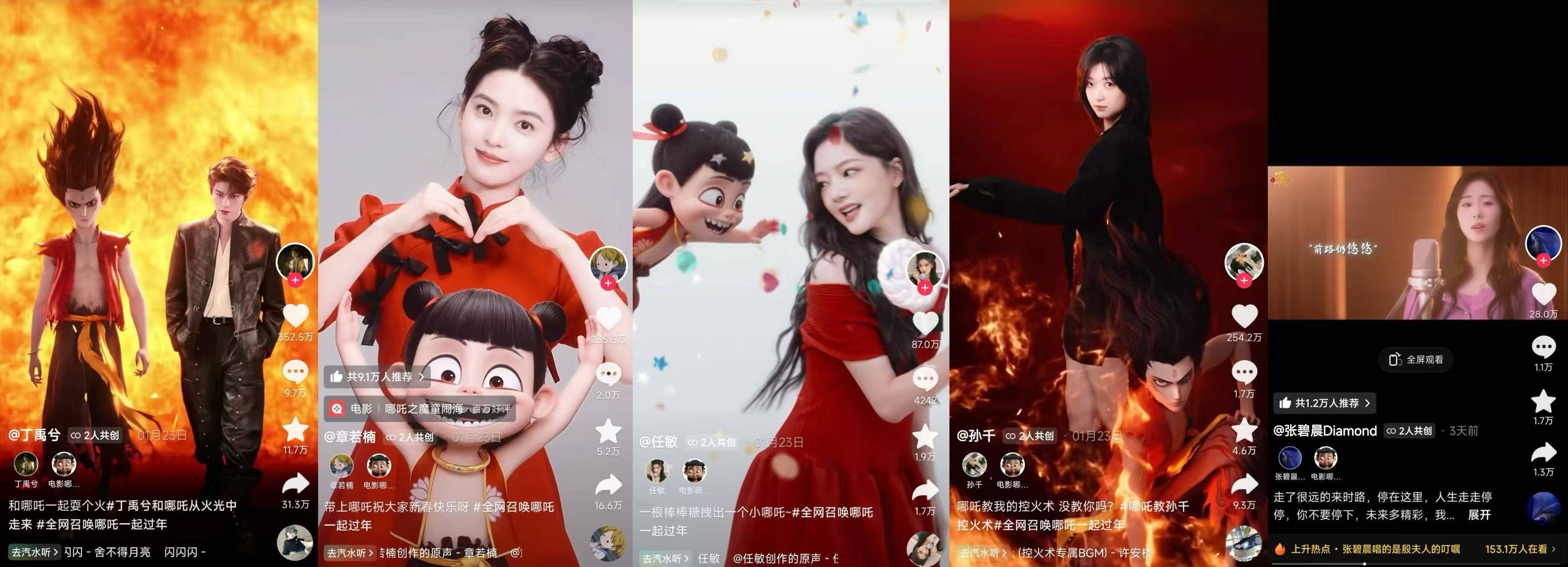 抖音更邀请丁禹兮、章若楠、任敏、孙千、张碧晨等艺人,与哪吒共创情景短视频,或帅气酷飒,或可爱温馨,吸引了大量网友的点赞与分享,进一步助推《哪吒之魔童闹海》热度"出圈"。