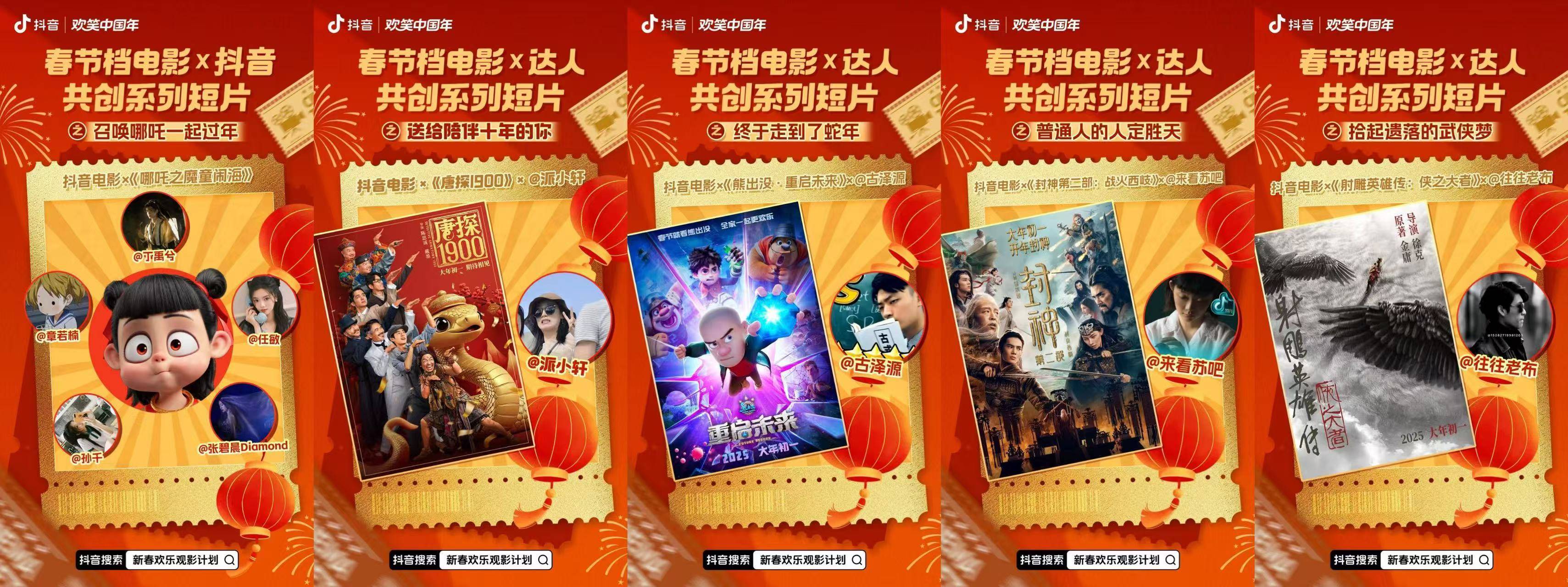 2025年春节档电影市场迎来了一场史无前例的狂欢--总票房破百亿、《哪吒之魔童闹海》登顶中国影史票房冠军、六部IP续作重磅上映,这场堪称"影史最强"的春节档以势如破竹的姿态刷新了多项纪录。作为大家的"最佳观影搭子",抖音「新春欢乐观影计划」携手《哪吒之魔童闹海》《唐探1900》《封神第二部:战火西岐》《熊出没:重启未来》《射雕英雄传:侠之大者》《蛟龙行动》(以当前票房排序)六部春节档影片,以"抖音电影百评团、电影主创直播、电影ip共创短视频、抽卡活动"等一系列丰富精彩的玩法,为大家打通从"映前种草"到"映后讨论"的一站式观影体验。
